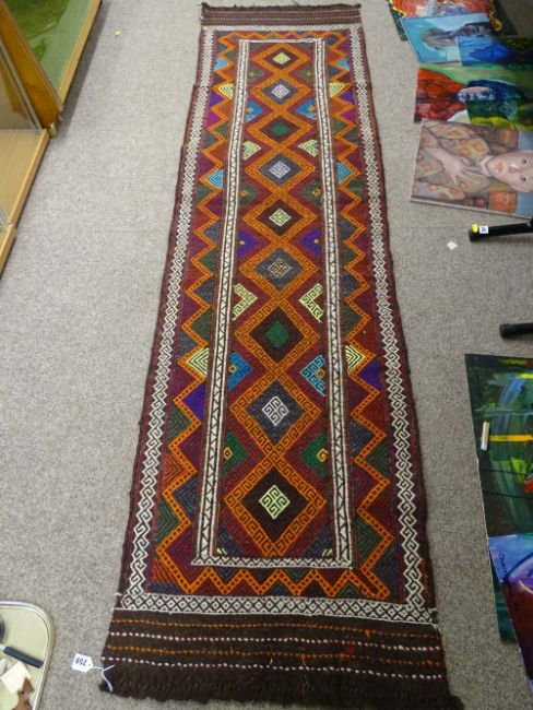 Suzni Kilim carpet runner, colourful multi-diamond pattern with Greek Key style bordered edges, 240 x 63 cms