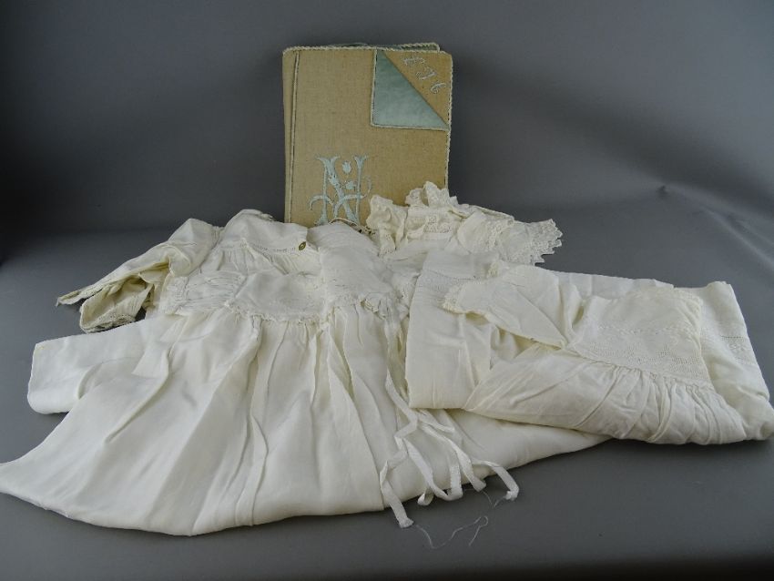 Needlework album created in 1896 containing various items depicting the needlework capabilities of the owner, the rear pouch containing a christening gown along with four further antique christening gowns