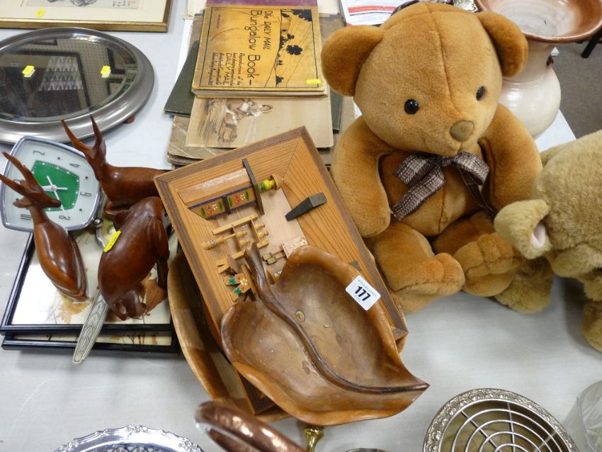 Two soft toys, quantity of treen, framed prints, vintage clock etc