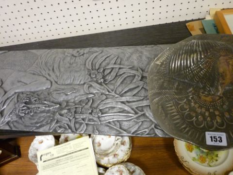 Celtic Tradecraft plaque depicting an Art Nouveau style maiden, initialled 'P B L' and a pewter plaque of an Egyptian goddess
