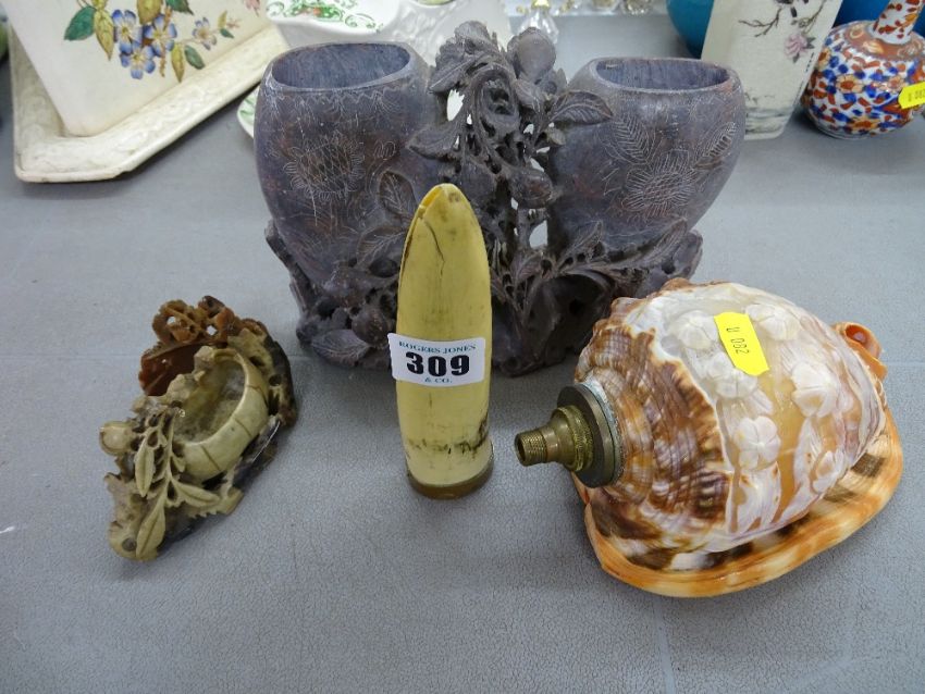 Cameo carved conch shell lamp top, three carved soapstone ornaments etc