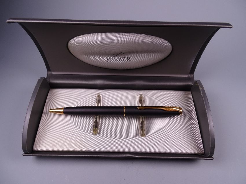 A MODERN (1990s-) MATT BLACK PARKER SONNET BALLPOINT PEN with gold plated trim, in original box