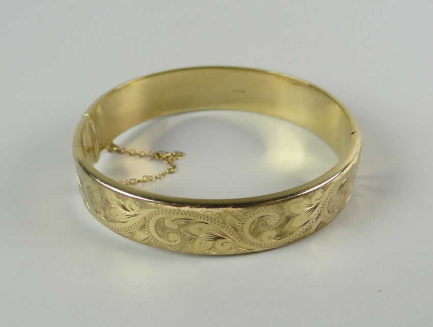 A 9CT GOLD LADIES SCROLL & FOLIATE ENGRAVED BANGLE, 15.9grams approx.