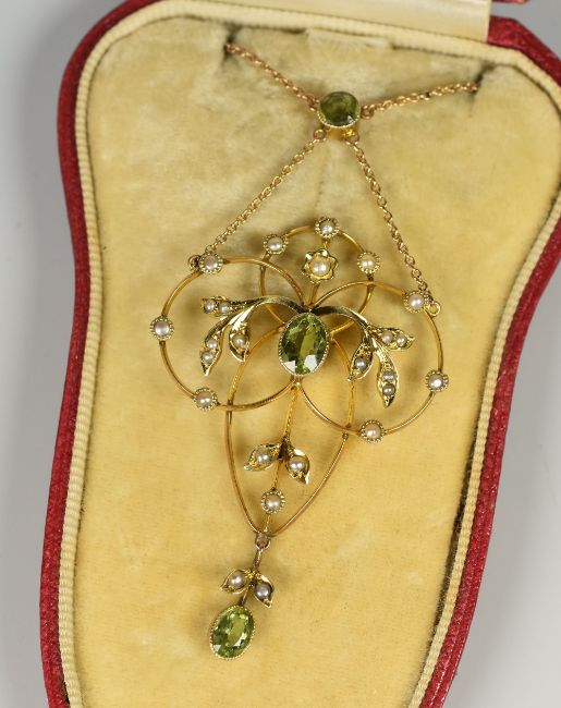 EDWARDIAN 9CT GOLD PERIDOT & SEED PEARL OPENWORK PENDANT ON CHAIN in original fitted box, Andrew King Jeweller & Silversmith, 62 Marketplace Hall
