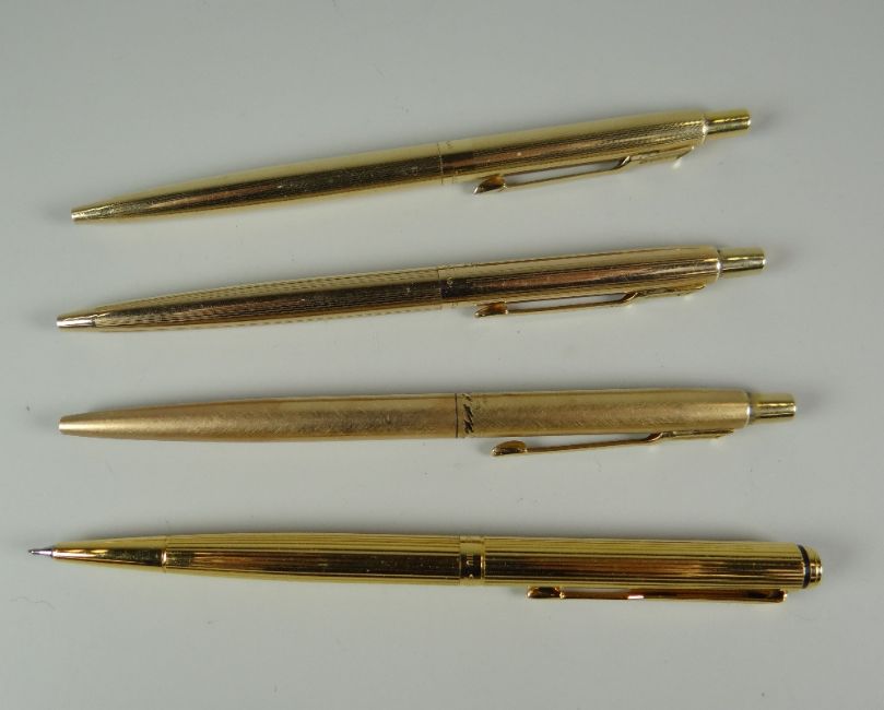 THREE VINTAGE ROLLED GOLD PARKER CLASSIC BALLPOINT PENS 1 in brushed gold with polished cut design, 1 International Insignia design, 1 fine barley design together with a Parker 95 rolled gold ballpoint pen