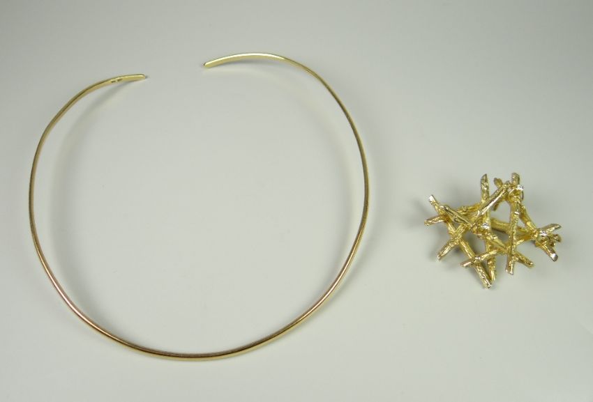 A UNIQUE 100% WELSH 18CT YELLOW GOLD ABSTRACT TWIG-FORM PENDANT BY WELSH JEWELLERY DESIGNER NICOLA PALTERMAN (nee Williams) and being of abstract organic form comprising eight bark-textured twigs in criss-cross and set with three round-brilliant cut diamonds, pendant previously tested as 18ct, 38gms and consisting of rare mined Welsh gold from the Gwynfynydd Mine near Dolgellau (note - the fastener is not Welsh gold and is marked Alopa and is accompanied together by an 18ct yellow gold torque necklet which is Welsh gold, 68gms)