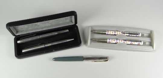 A VINTAGE BOXED STAINLESS STEEL PARKER 25 FOUNTAIN PEN & BALLPOINT PEN SET together with a vintage navy grey Parker 51 fountain pen with silver coloured cap & gold trim (in box with instructions) & a modern Vector ballpoint pen & pencil set with flower design (in original box)