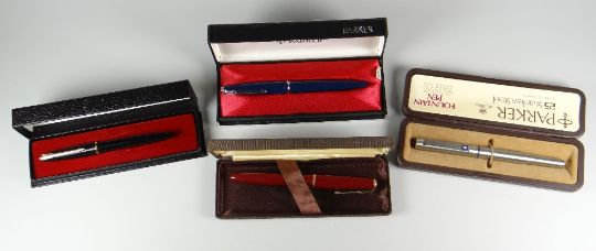 A VINTAGE BLUE PARKER 45 FOUNTAIN PEN with chrome trim, a Parker 17 fountain pen with gold trim (both boxed), a vintage stainless steel Parker 25 fountain pen (in original box) & a vintage boxed red Parker Junior fountain pen with gold trim