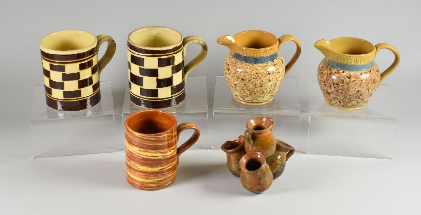 A PARCEL OF SLIPWARE POTTERY VESSELS including veined marble mug, pair of geometric pattern mugs, pair of jugs etc