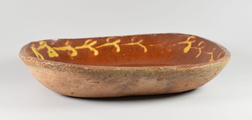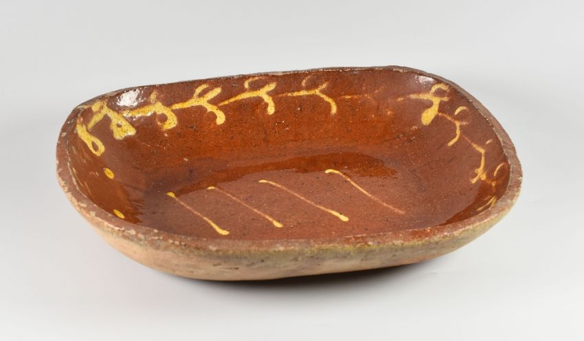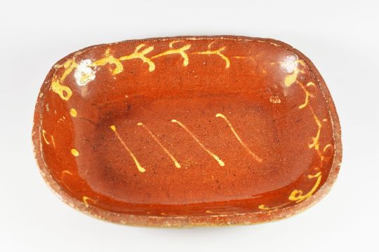 A SLIPWARE BAKING DISH with four-line cream slip decoration to the interior and trail to the border, believed 19th Century, 32cms long