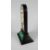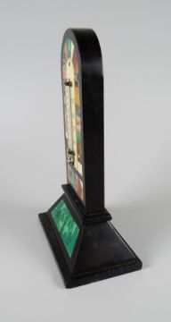 NINETEENTH CENTURY BLACK MARBLE ARCH TOPPED DESK THERMOMETER inlaid with specimen patch work or scrap work borders, possibly Derbyshire, 16.5cms high