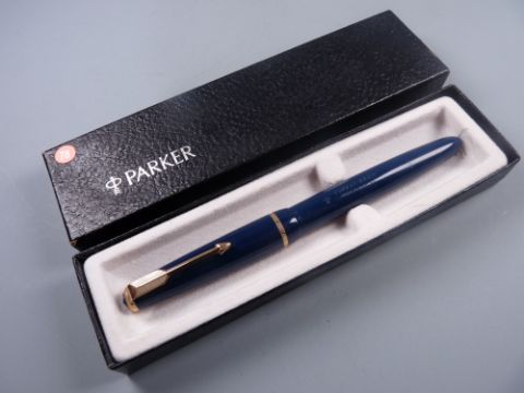 A VINTAGE BOXED BLUE PARKER DUOFOLD JUNIOR FOUNTAIN PEN with gold plated trim & 14ct gold nib