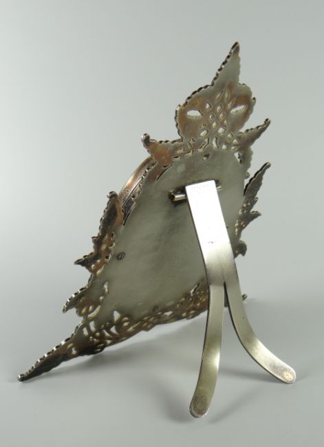 Condition: wear to silver plating, some losses to inlay of floral spray, easel stand slightly misshapen although still functioning.