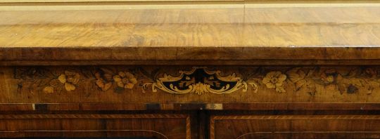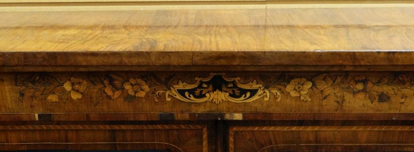 NINETEENTH CENTURY WALNUT TWO-DOOR CHIFFONIER / PIER CABINET the projecting top above floral & scroll inlaid frieze above two glazed cupboards revealing two adjustable shelves, flanked by gilt metal corbels, all raised on a platform-type base with shaped apron, 120 x 33 x 105.5cms