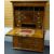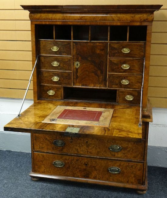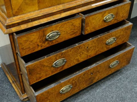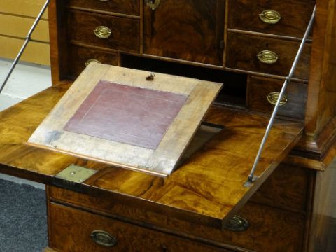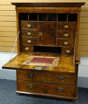 Condition: front panel of cupboard has splits in an almost H design, dry in places with splits & chippings to rims, top right part of cornice is loose, veneer bubbling & losses throughout, interior drawer configuration again has splits, adjustable writing slope surface is tired & dry with ratched mechanism behind partially broken (there is a key available).