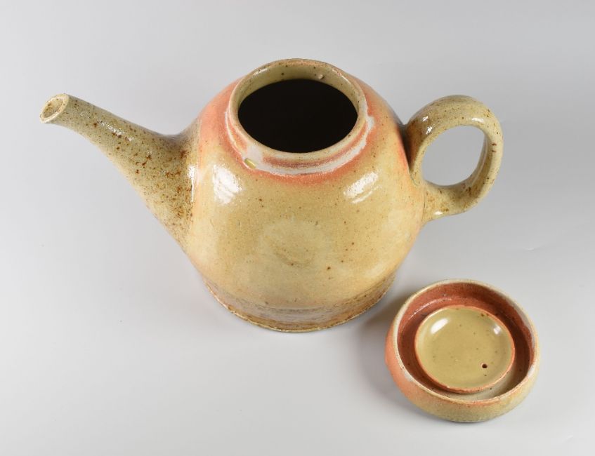 A SARAH WALTON STUDIO POTTERY SALTGLAZED TEAPOT with loop handle and disc lid, potter's mark, 15cms high