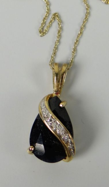 A MODERN 9CT YELLOW GOLD, SAPPHIRE & TINY DIAMOND PENDANT & FINE CHAIN