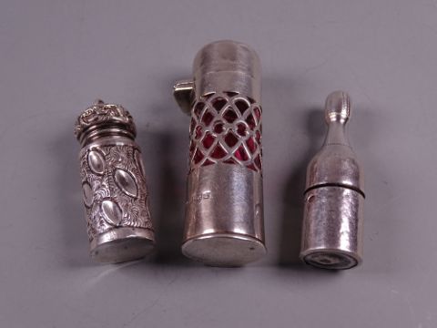 A SILVER & RUBY GLASS PERFUME CONTAINER, the body with lattice work and with a hinged lid (no stopper), Birmingham 1903, a further tiny pillar shaped silver perfume container, Birmingham 1902 and a plain silver skittle shaped perfume container (parcel of three)