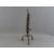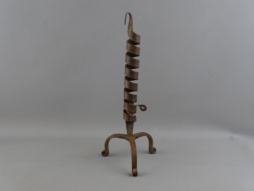 AN ANTIQUE WROUGHT IRON COURTING CANDLE HOLDER having a spiral twist column on a tripod base and tightly curled feet, 31 cms high