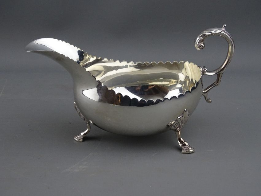 AN IRISH CLASSICAL DESIGN SILVER GRAVY BOAT, Dublin 1968, 6.3 troy ozs, classical 'C' shaped handle on three hoof feet