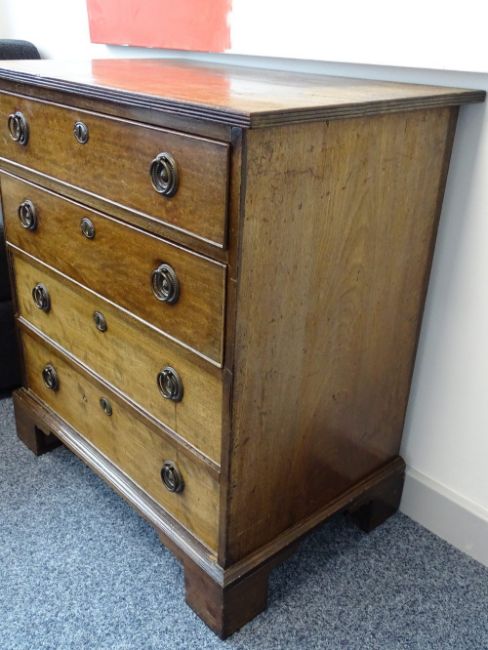 A NEAT MAHOGANY CHEST OF FOUR DRAWERS, oak lined with circular brass backplates and ring pull handles, raised on corner bracket feet (re-polishing and slight restoration required), early 20th Century, 75.5 cms high, 68.5 cms wide, 45 cms deep