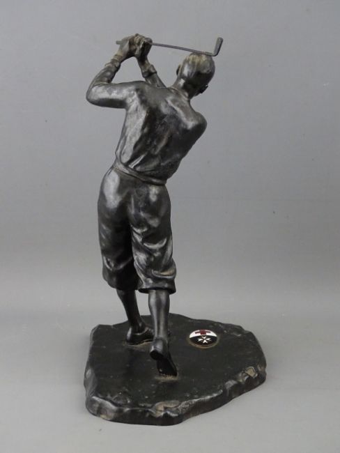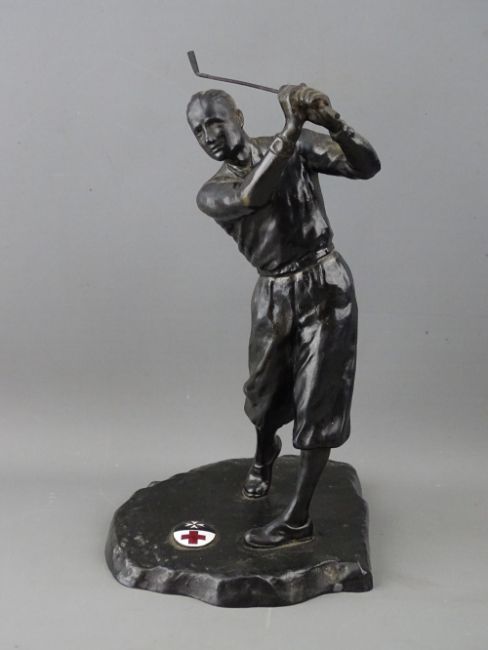 A VINTAGE CAST METAL FIGURE OF A GOLFER, the base set with an oval enamel plaque showing the emblems for the Red Cross and St John's Order, the rear with indistinct impressed marks, 23.5 cms high