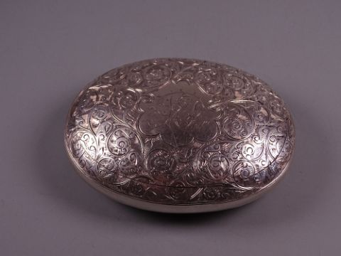 AN OVAL SILVER SNUFF/TOBACCO CONTAINER with all over scrolled decoration, 2.6 troy ozs, Birmingham 1901 by Thomas Hayes