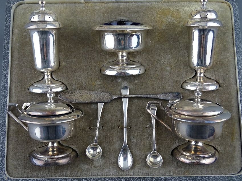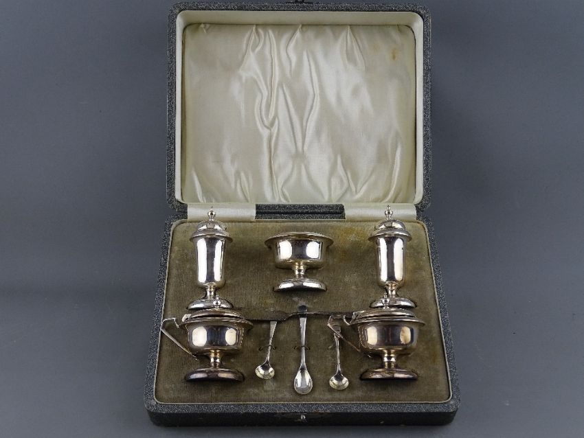 A CASED FIVE PIECE SILVER CRUET SET with spoons, Birmingham 1915 & 1916, blue glass liners intact, loaded bases along with a small silver butter knife, Sheffield 1928