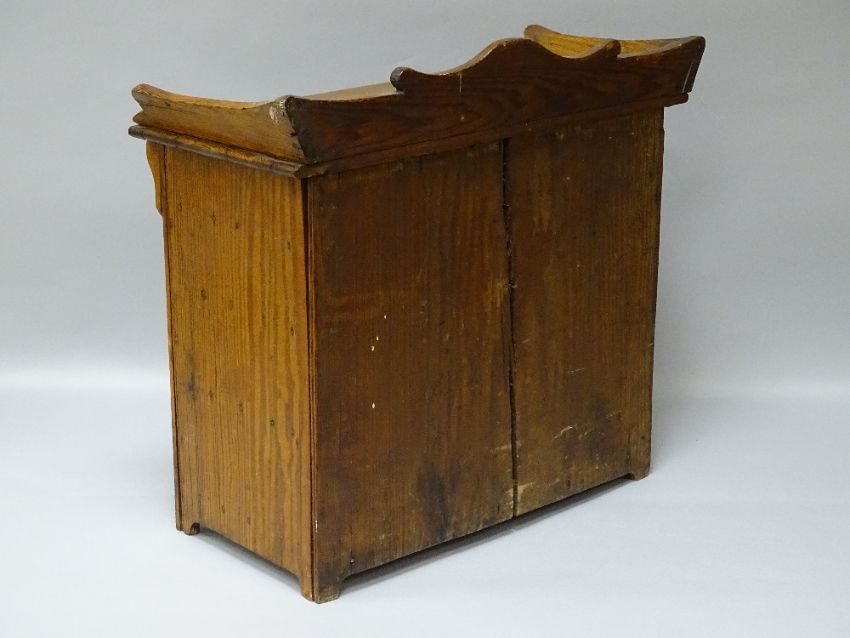 A VICTORIAN PITCH PINE APPRENTICE CHEST of five drawers, the rectangular top with splashback rail, 47 cms high overall, 51 cms wide maximum, 24 cms deep