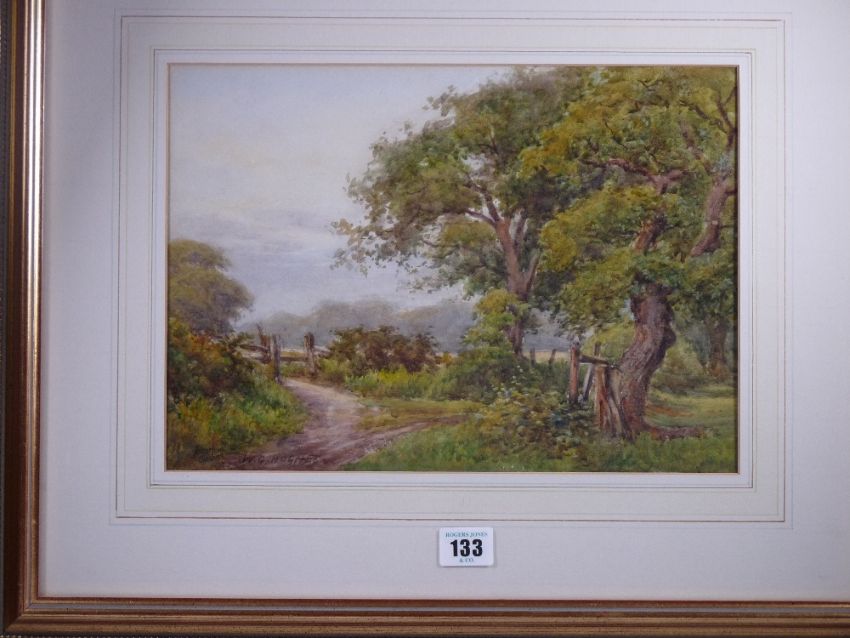 W G HUGHES watercolour - rural scene with wooded track and stile, signed and indistinctly titled and dated, 23 x 33 cms