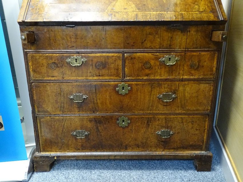 A LATE 18th CENTURY WALNUT FALL FRONT BUREAU with interior drop down well and fitted arrangement of pigeonholes and drawers over two short and two long oak lined drawers and decorative later brass furniture, 96 cms high, 89 cms wide maximum, 49 cms deep