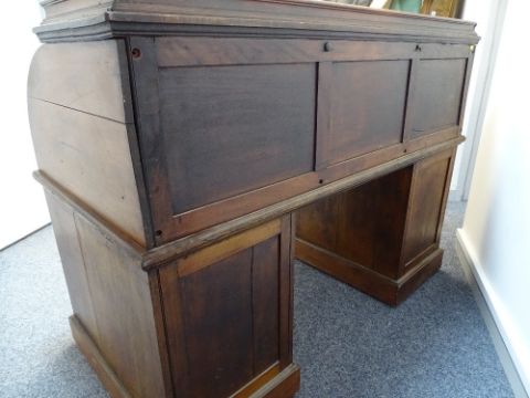 A VICTORIAN MAHOGANY TWIN PEDESTAL CYLINDER FALL BUREAU, the interior with slide-out work surface and a mixed arrangement of pigeonholes and drawers, 114 cms high, 152 cms wide, 76 cms deep
