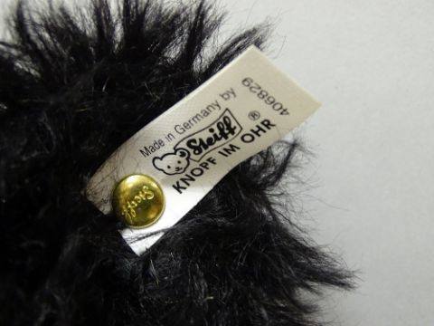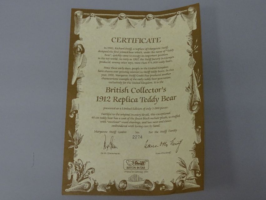 A STEIFF BRITISH COLLECTOR'S 1912 REPLACE TEDDY BEAR in black mohair, button in ear white tag no. 02274/3000, boxed with certificate, 49 cms long