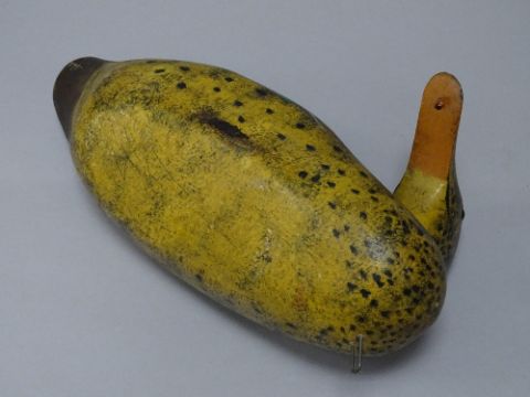 A VINTAGE CARVED WOOD & PAINTED DUCK DECOY, 33 cms long