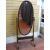 A REGENCY STYLE MAHOGANY OVAL DRESSING MIRROR with reeded and gilt highlighted decoration and cone finial caps, 176 cms high overall, 71 cms wide