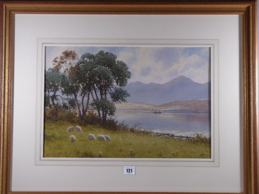 WARREN WILLIAMS ARCA watercolour - peaceful Conwy River scene with boats steaming towards Trefriw and sheep in the foreground, signed, 32 x 48 cms (slight foxing to sky area)