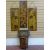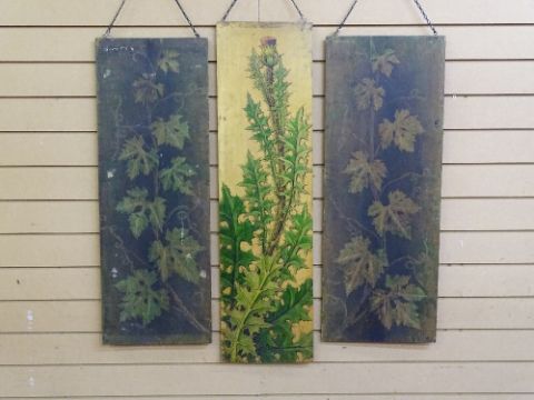 AN ARTS & CRAFTS STAINED POKERWORK WASTEPAPER BIN, a two handled tray and three floral decorated panels, 48 cms high the bin