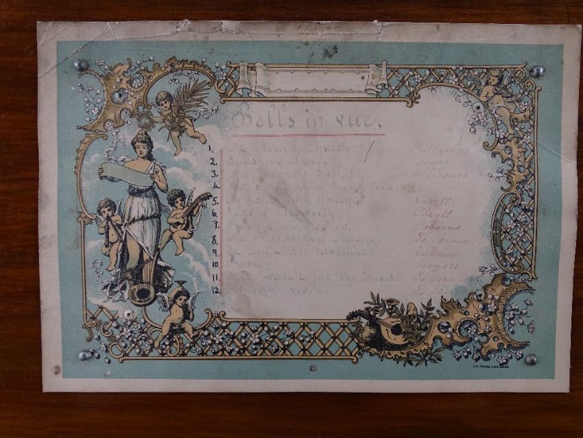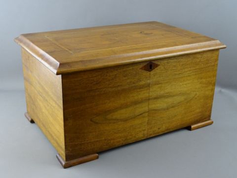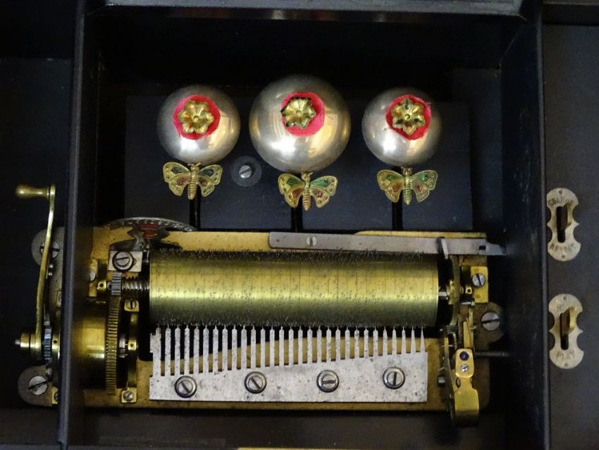A 19th CENTURY SWISS CYLINDER MUSIC BOX with 16 cms brass cylinder and bells in view playing twelve airs, the bell strikes fashioned as butterflies, the lid with interior tune card, 22.5 cms high, 42.5 cms wide, 28.5 cms deep