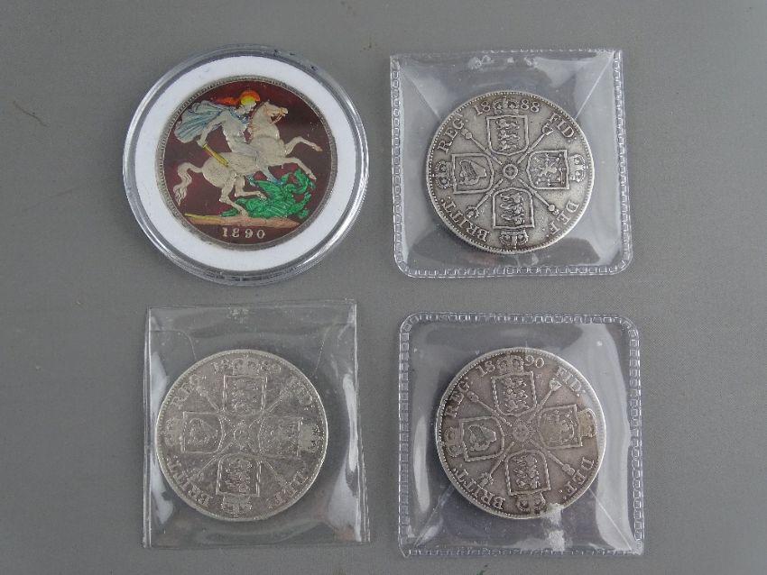 AN 1890 SILVER CROWN, enamel on George & Dragon side, 27 grms and three double silver florins dated 1888, 1889 and 1890, 22 grms each