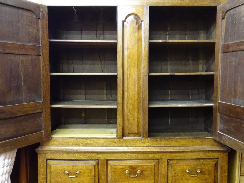 A GOOD 18th CENTURY WELSH OAK PRESS CUPBOARD with shaped and chamfered panels and a full mixed arrangement of eight lower drawers, original brass escutcheons, pommel plates and swan neck handles, the whole of peg joined construction with excellent colour, 217 cms high, 157 cms wide, 56 cms deep