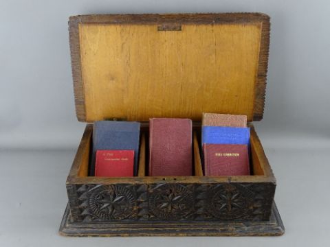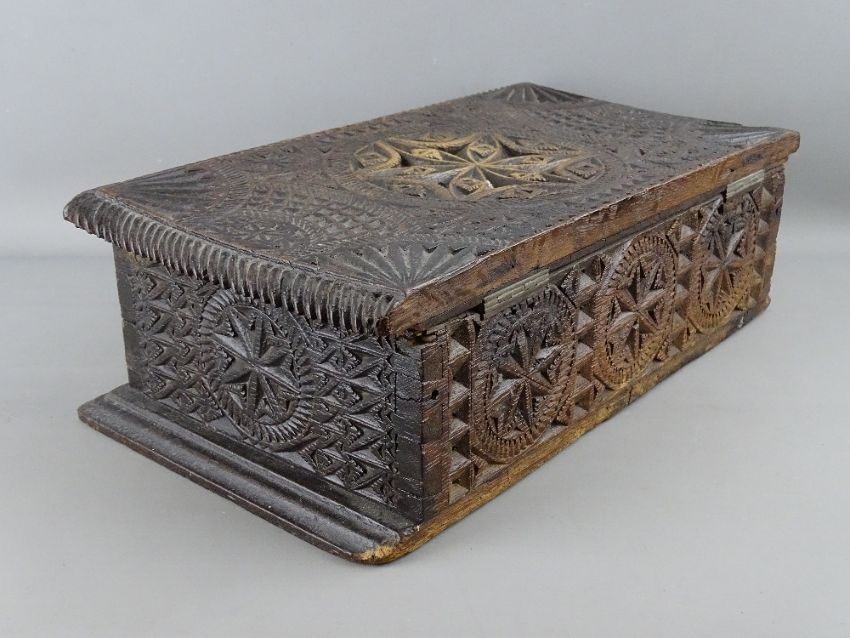 A NEAT HEAVILY CARVED OAK BIBLE BOX, 13 cms high, 41 cms wide, 23 cms deep