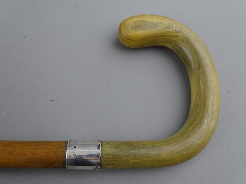 THREE HORN HANDLED WALKING STICKS with hallmarked silver collars, 92.5 cms the longest