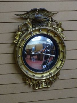 A REGENCY STYLE GILT CONVEX WALL MIRROR with eagle cresting and ball detail, 81 cms long overall, 53 cms wide, (some restoration required)