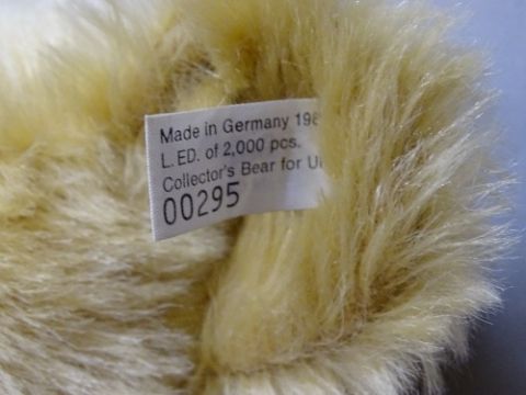 A STEIFF BRITISH COLLECTOR'S TEDDY BEAR, 1907 replica, blonde mohair, circa 1995, limited edition, ear button tag number 00295/2000, boxed with certificate, 56 cms long
