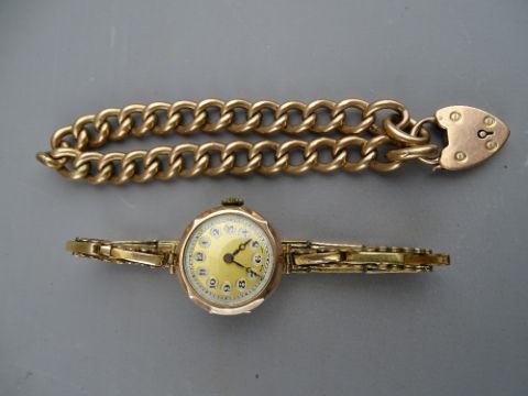 A NINE CARAT CHESTER GOLD CASED LADY'S WRISTWATCH on expanding gold plated strap with a nine carat gold curb chain bracelet with padlock clasp, 17 grms chain only