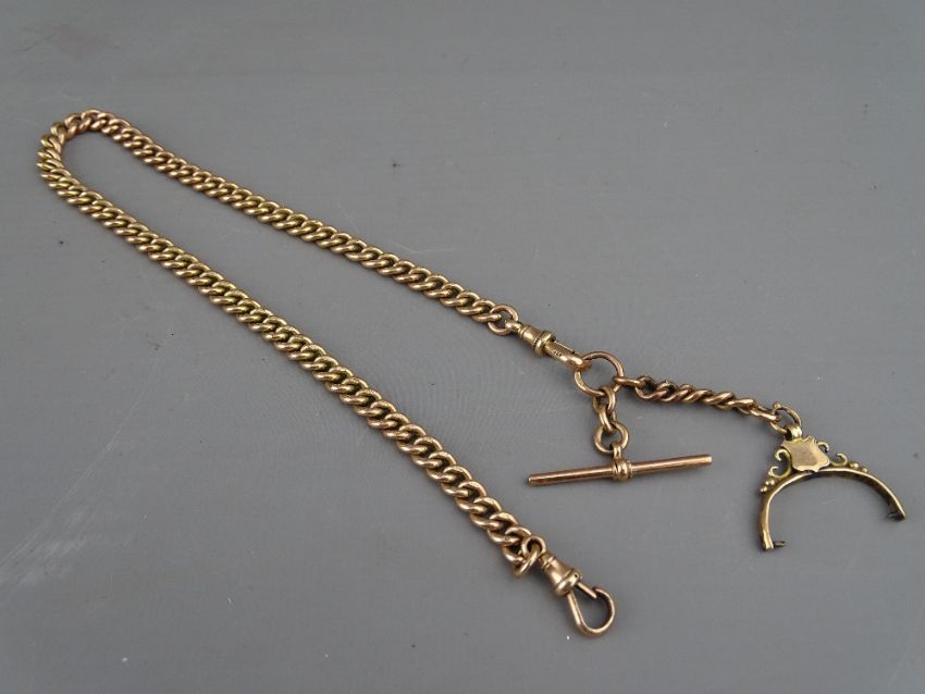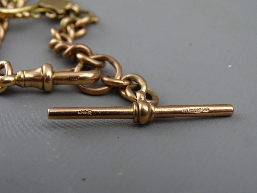 A NINE CARAT GOLD ALBERT CHAIN WITH FOB CLIPS, T-bar and swivel fob mount (missing fob), 51 grms gross, all fully stamped, 44 cms long overall
