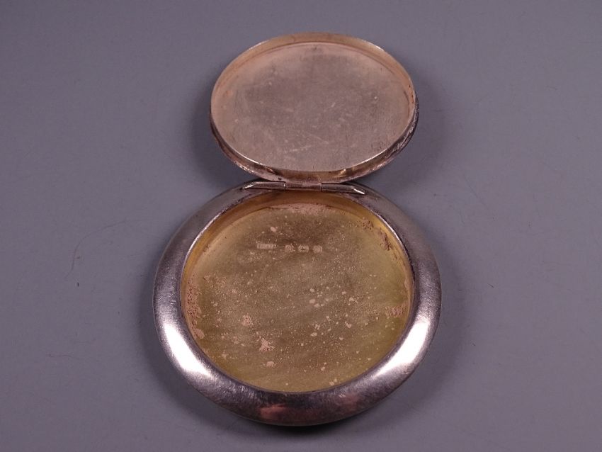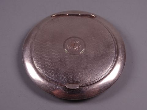 A CIRCULAR SILVER LADY'S POWDER COMPACT with engine turned lid and initials to the centre, 1.1 troy ozs, Birmingham 1937 by S M Levi Ltd