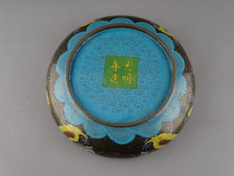 A GOOD CHINESE CLOISONNE DRAGON BOWL, 25 cms diameter, depicting five toed dragons chasing flaming pearls, the base with four character Tongzhi mark, late 19th Century