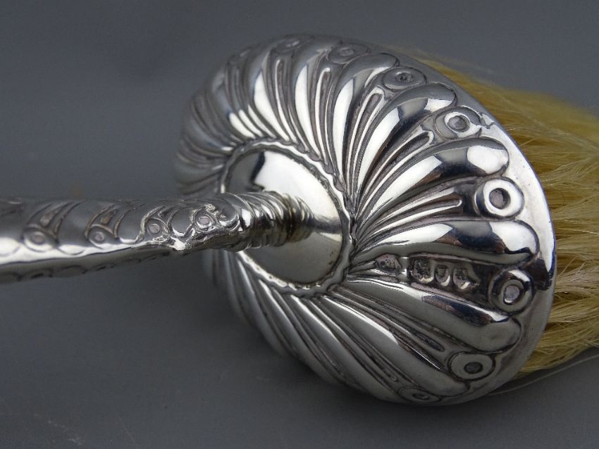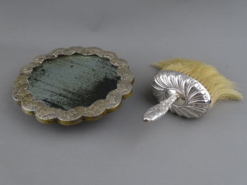 A VICTORIAN SILVER BONNET BRUSH and an Eastern white metal circular hand mirror with Hoho bird handle to the top, 16 cms diameter