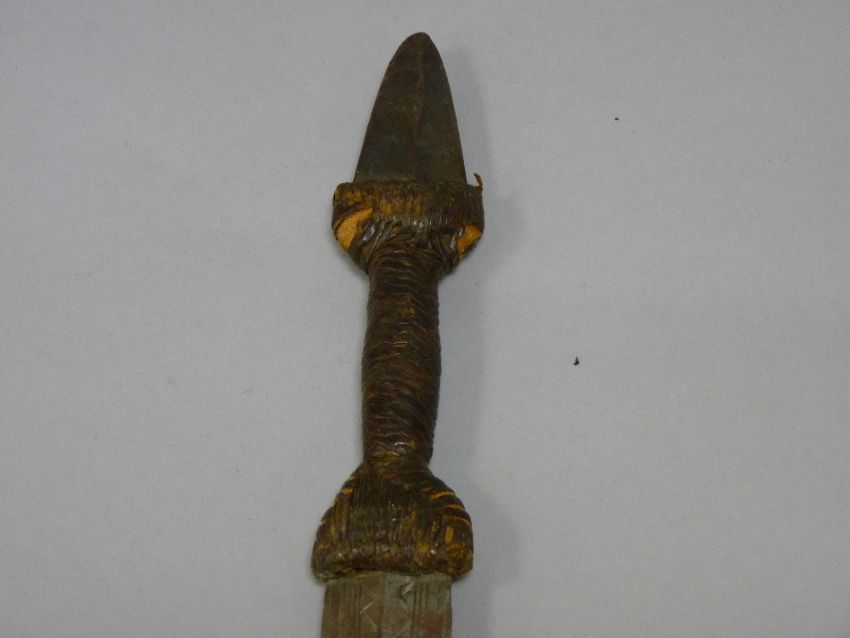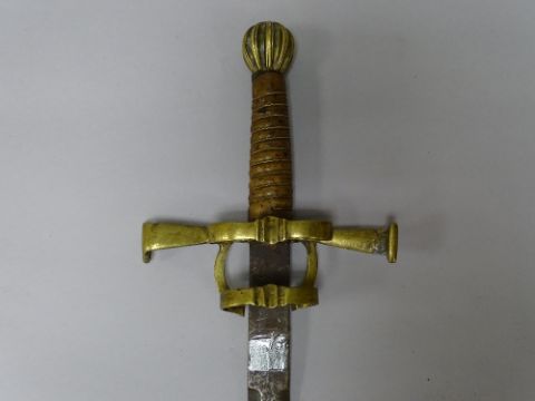 FOUR VINTAGE & REPRODUCTION SWORDS including an African tribal sword with bound grip and leather sheath, a bandsman type with eagle head pommel and crossguard in brass and metal scabbard, an antique style rapier with leather and brass scabbard and a Medieval type long sword with brass cross and ring guard hilt, various measurements